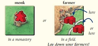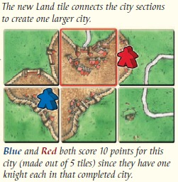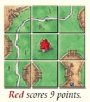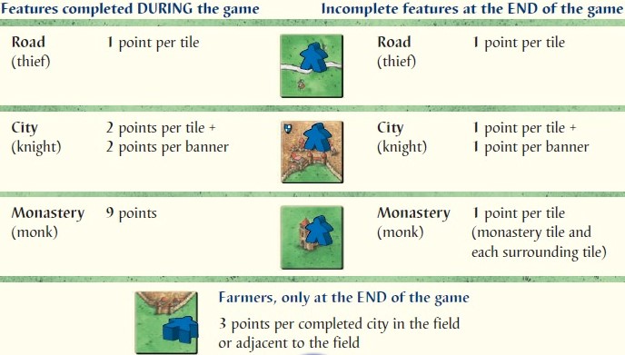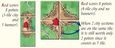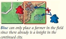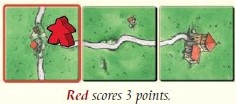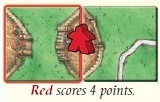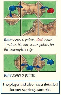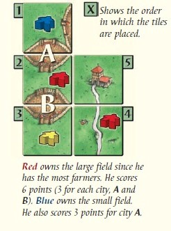 - For each city that the field touches, the player with the most farmers in that field scores 3 points. The size of the city does not matter. If some players are tied for the most farmers, they each score the points for that field.