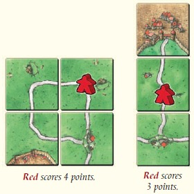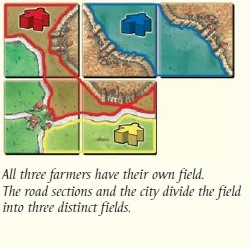 - Field 3: Yellow is the sole player to score Field 3 since he has more followers than Black. There are 4 completed cities touching Field 3, so Yellow scores 12 points. Note about field demarcations: Fields are separated from one another by roads and cities as well as the edge of the board.