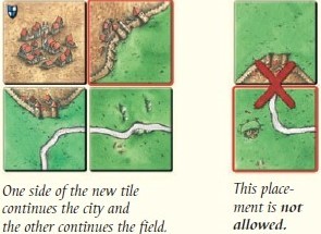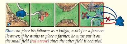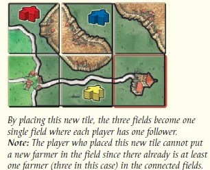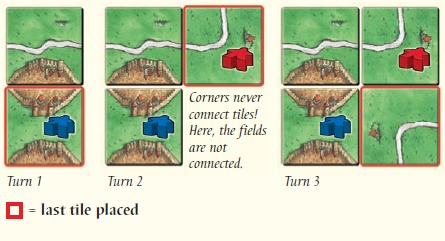 - Turn 2: Red places a tile diagonally adjacent to the one that Blue has just placed. Red can put his farmer in the illustrated field since both fields are not connected at that time.
