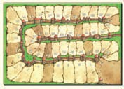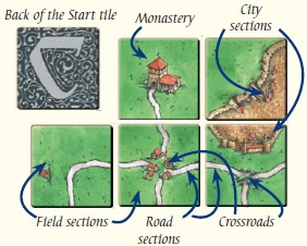 The Start tile is placed face-up in the center of the table. Shuffle the other tiles and place them in various face-down stacks to allow easy access for every player. Place the scoreboard close to the edge of the table to give players enough room to play their tiles in the middle of the table. Each player takes the 8 followers of his color and puts one (called marker thereafter) on the space numbered 0 of the scoreboard (it is the space located in the lower right-hand corner). Each player then keeps their remaining 7 followers in front of themselves: this is their personal supply. Players choose how the first player is designated, or simply let the youngest player begin.