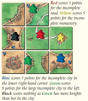 During the final scoring, incomplete roads, cities or monasteries are scored. A player who has a follower on an incomplete road, city or monastery scores 1 point per tile. For cities, each banner is also worth only 1 point. In case of a tie, use the same rules as for completed features. Once a feature is scored, return the follower to its supply. This should prevent any potential mistakes during the final scoring.