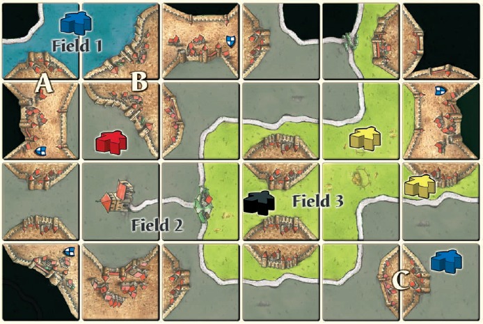 - Field 1: Blue is alone in Field 1. This field touches 2 completed cities (A and B). Blue scores 3 points for each city (no matter the size), for a total of 6 points.